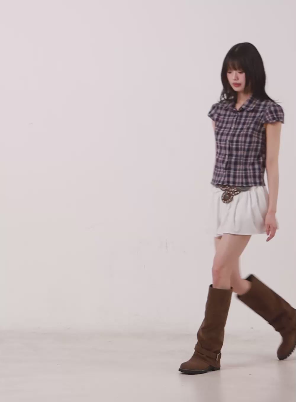 plaid-puff-sleeve-cropped-shirt-ca523 / Brown