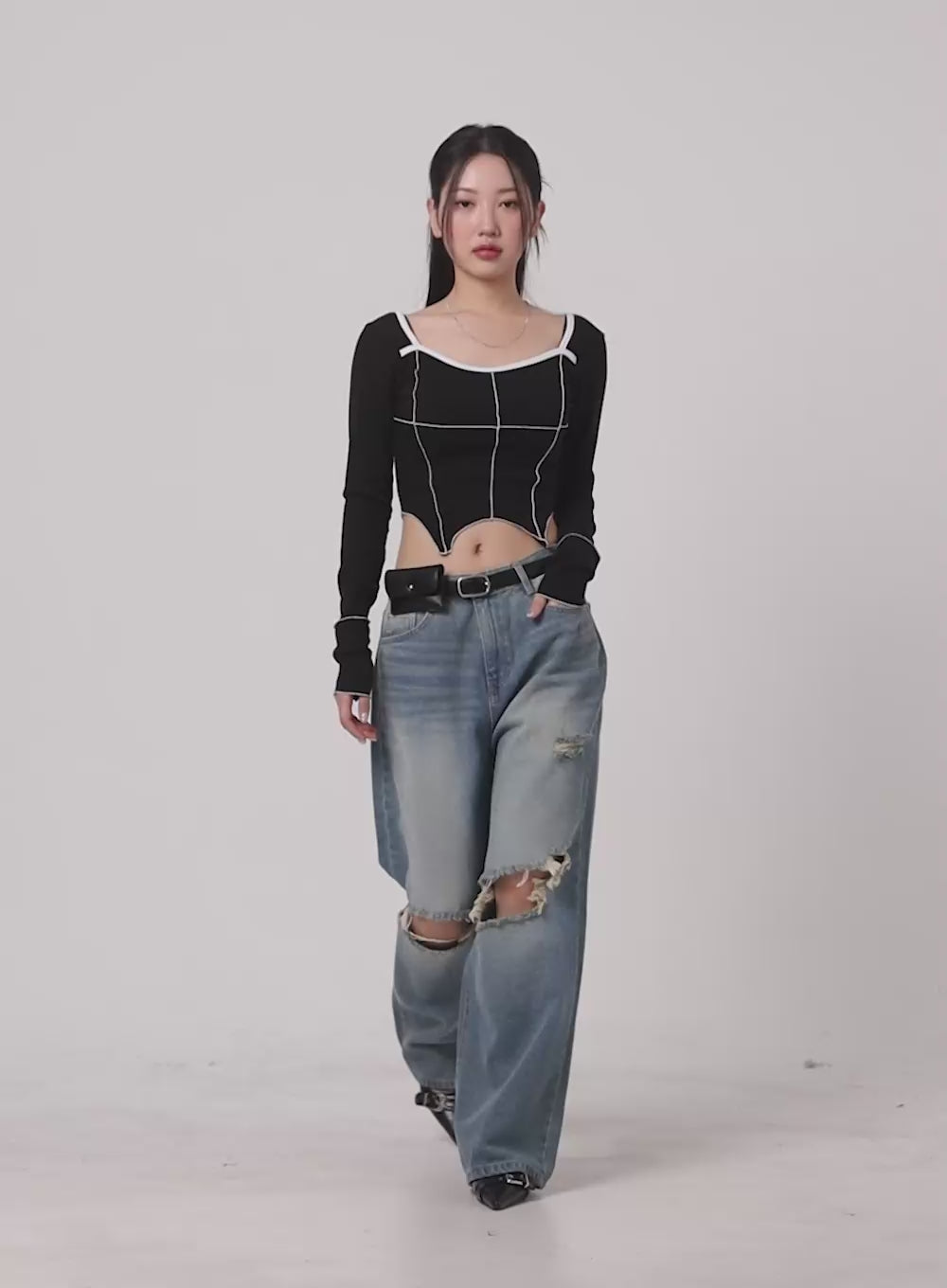u-neck-stitched-detail-cropped-long-sleeve-ca416 / Black