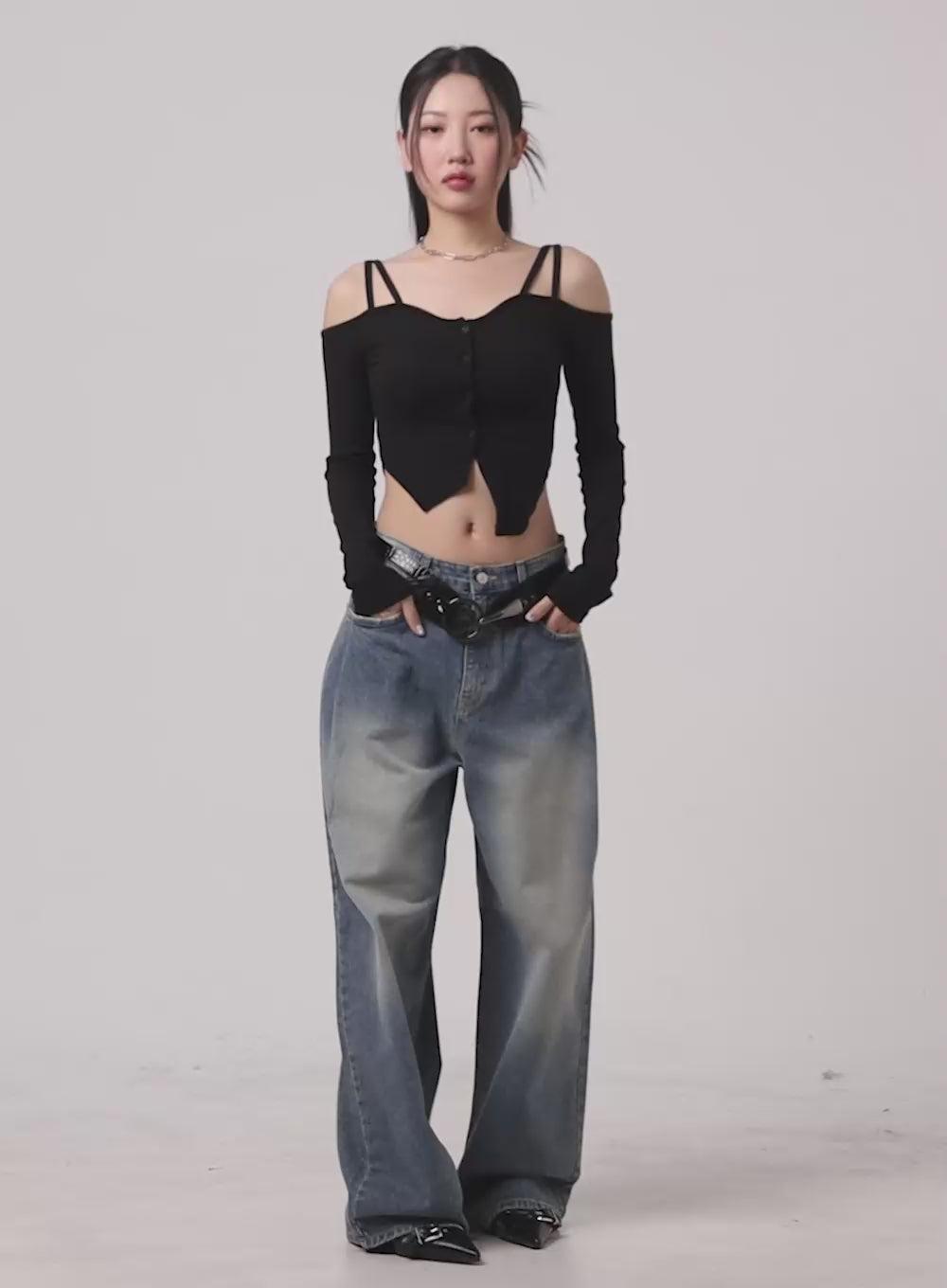pintuck-baggy-jeans-ca416 / Black