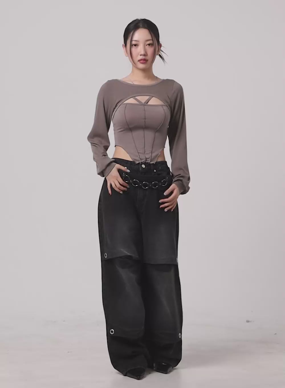 u-neck-stitched-detail-cropped-long-sleeve-ca416 / Gray