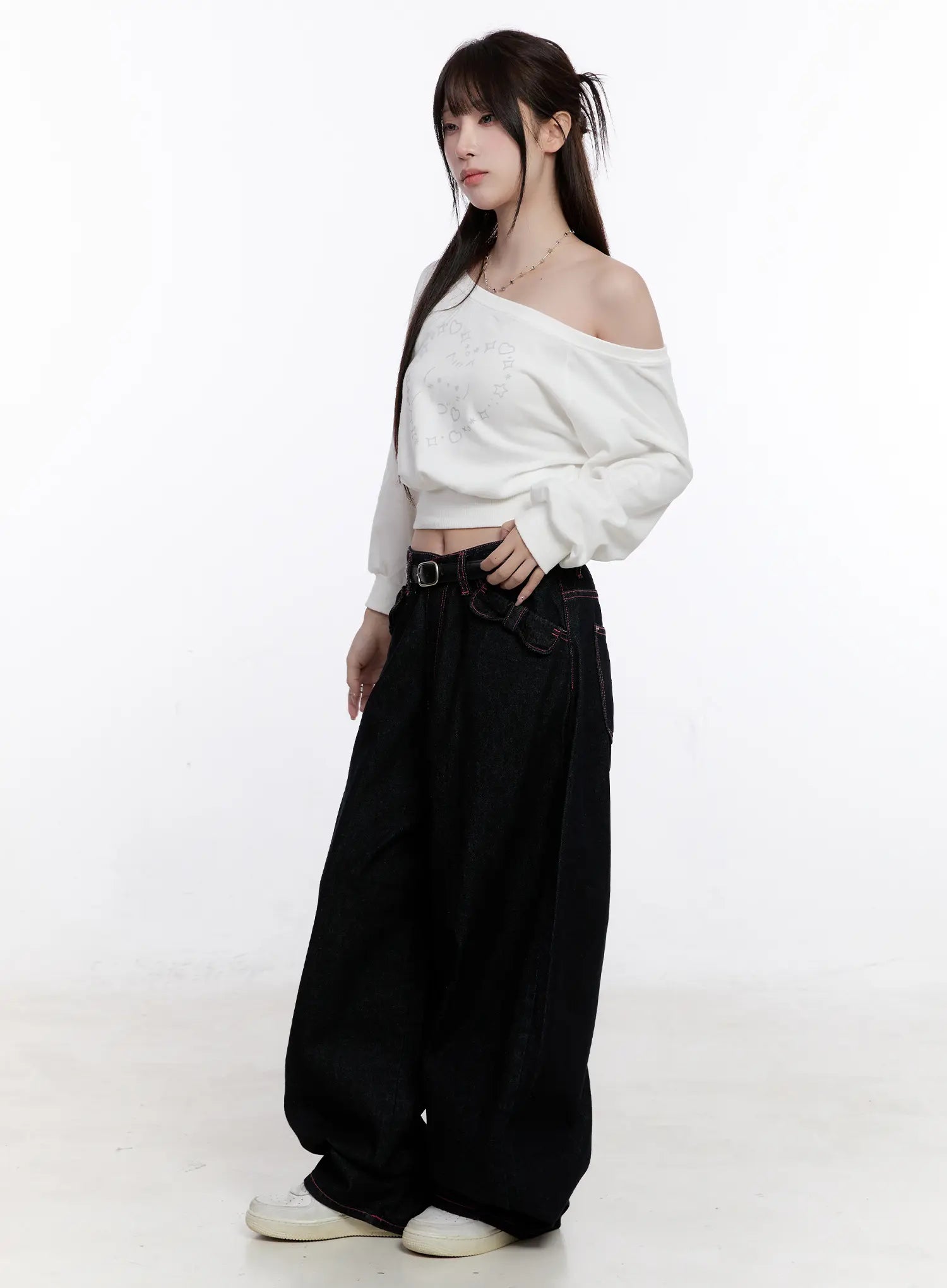 Cat Print Off-Shoulder Cropped Sweatshirt CO501