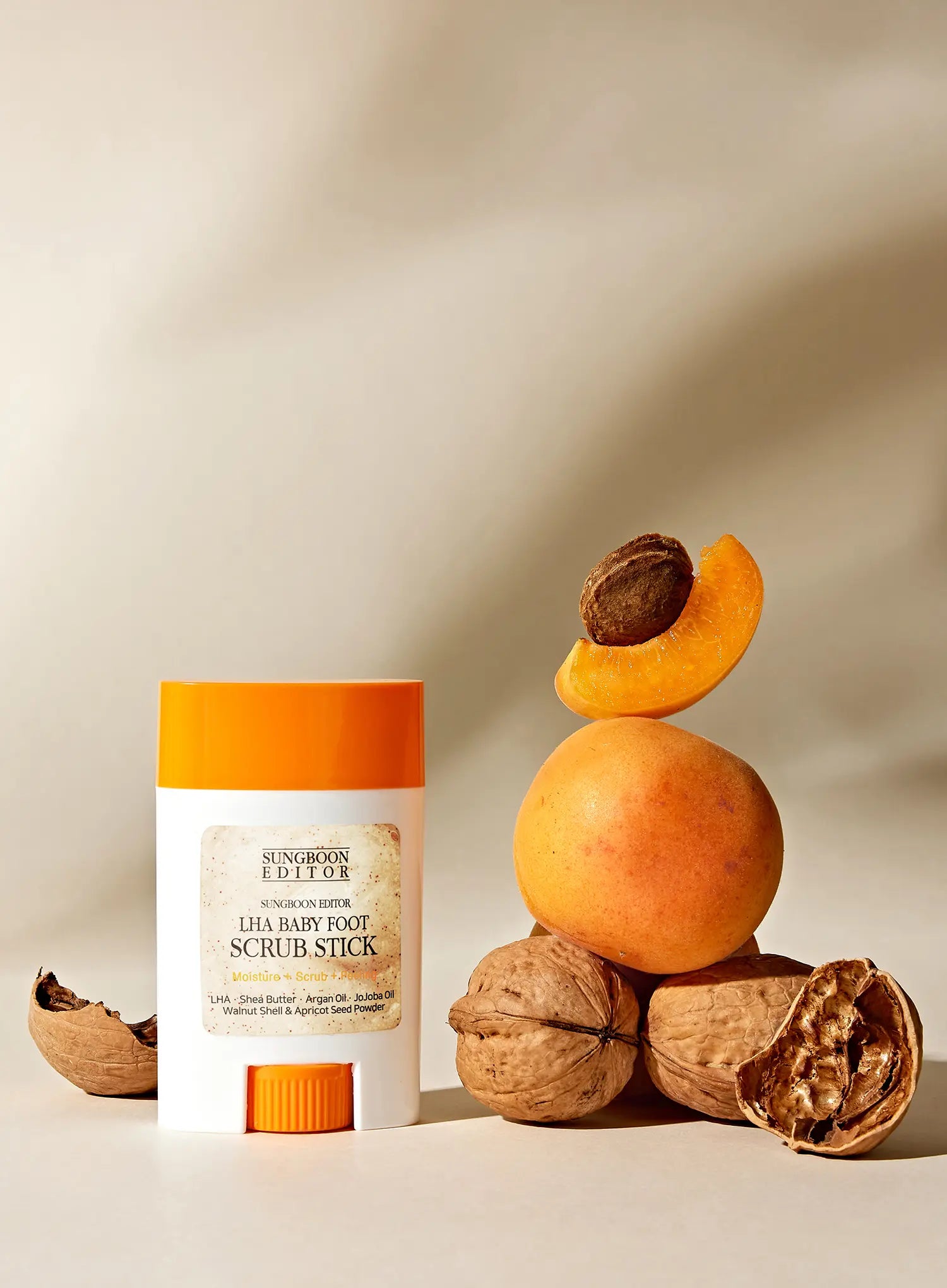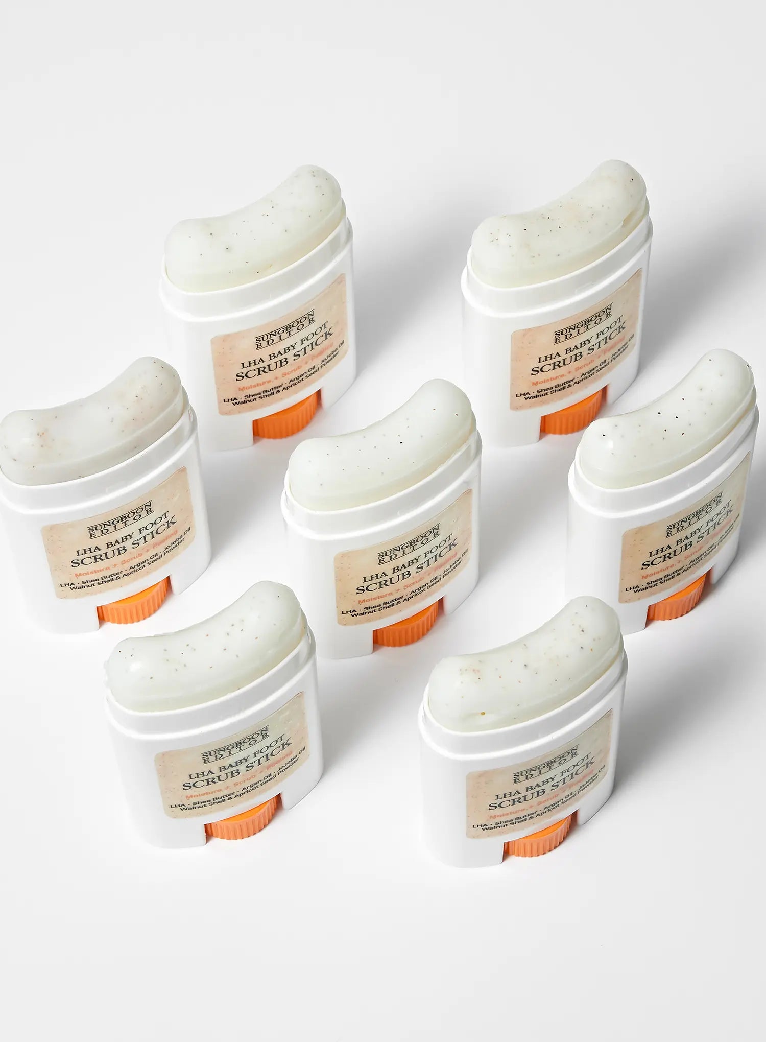 A peeling scrub stick enriched with LHA and natural oils to remove dead skin cells and reveal smoother, softer feet texture