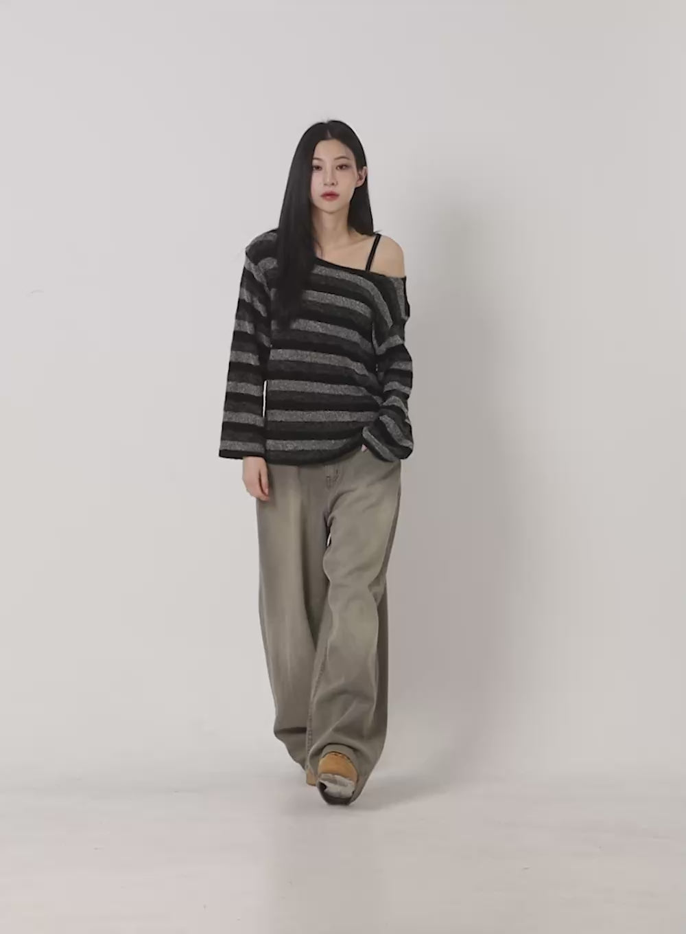 loose-fit-striped-knit-sweater-cn416 / Gray