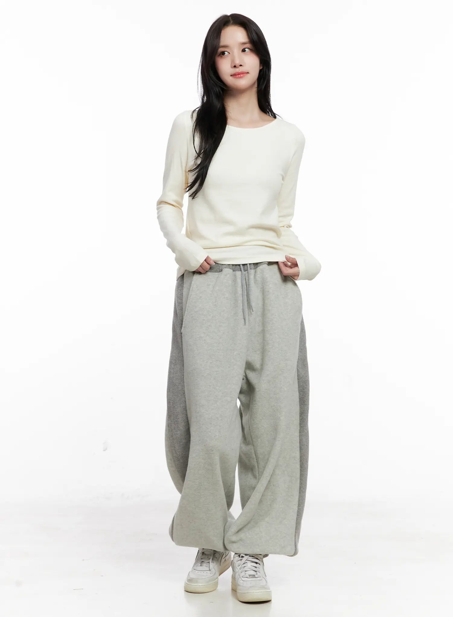 Model is wearing size S/M and the color Light beige.