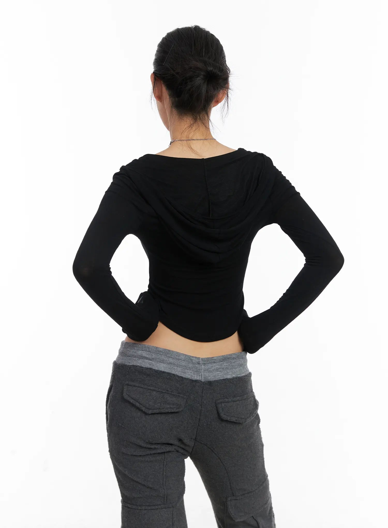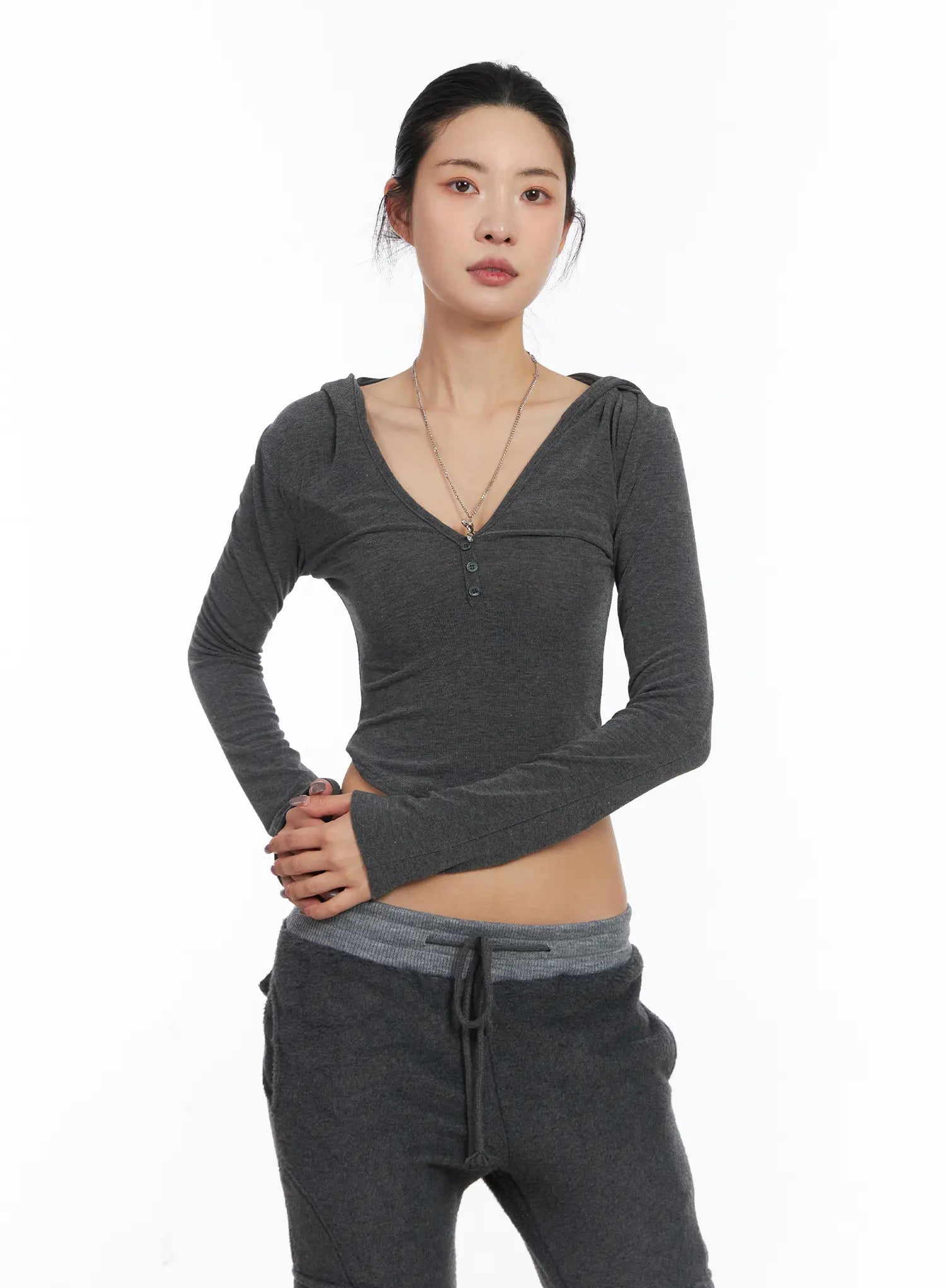 Buttoned Hooded Long Sleeve Crop Top CD509