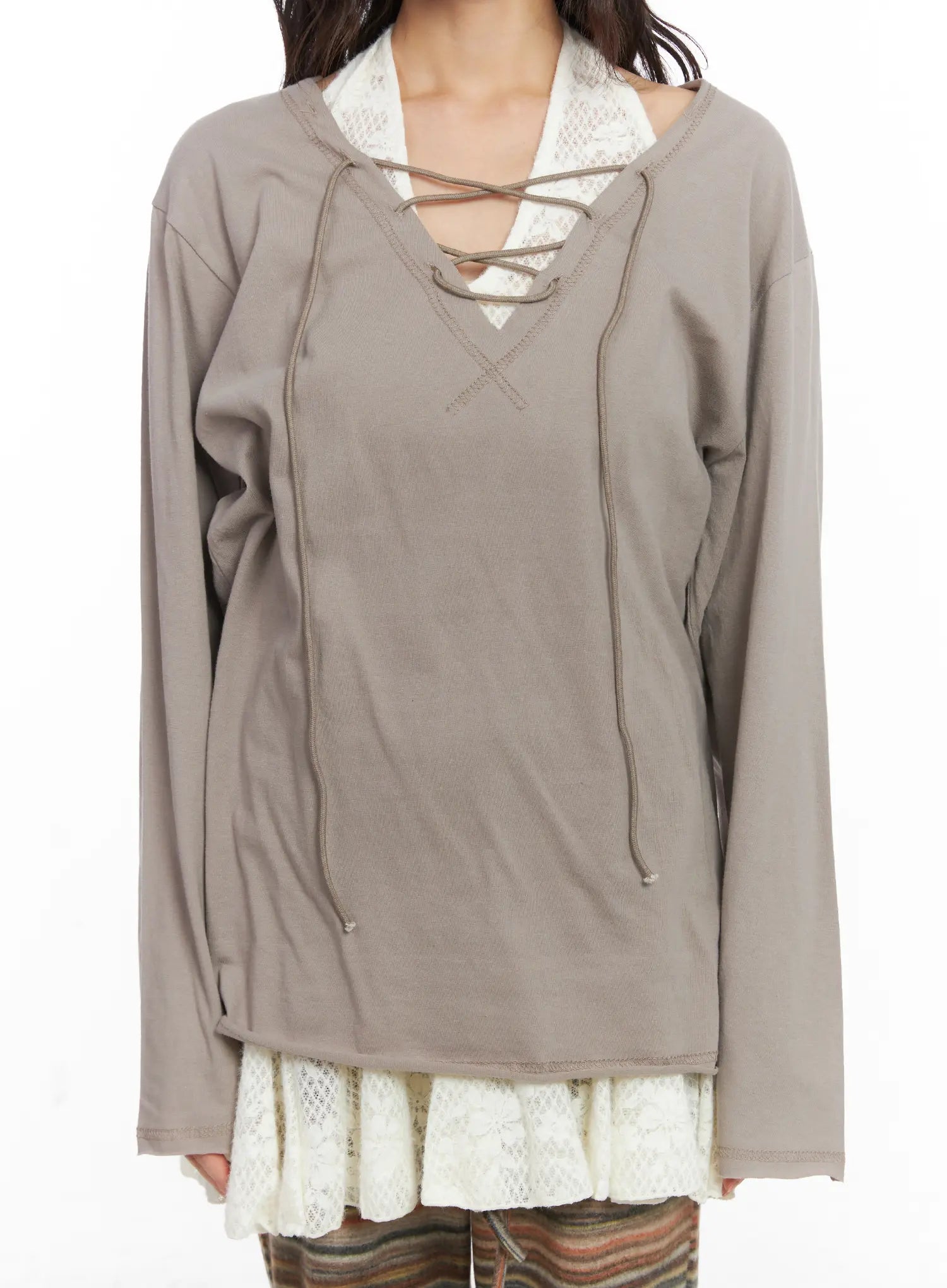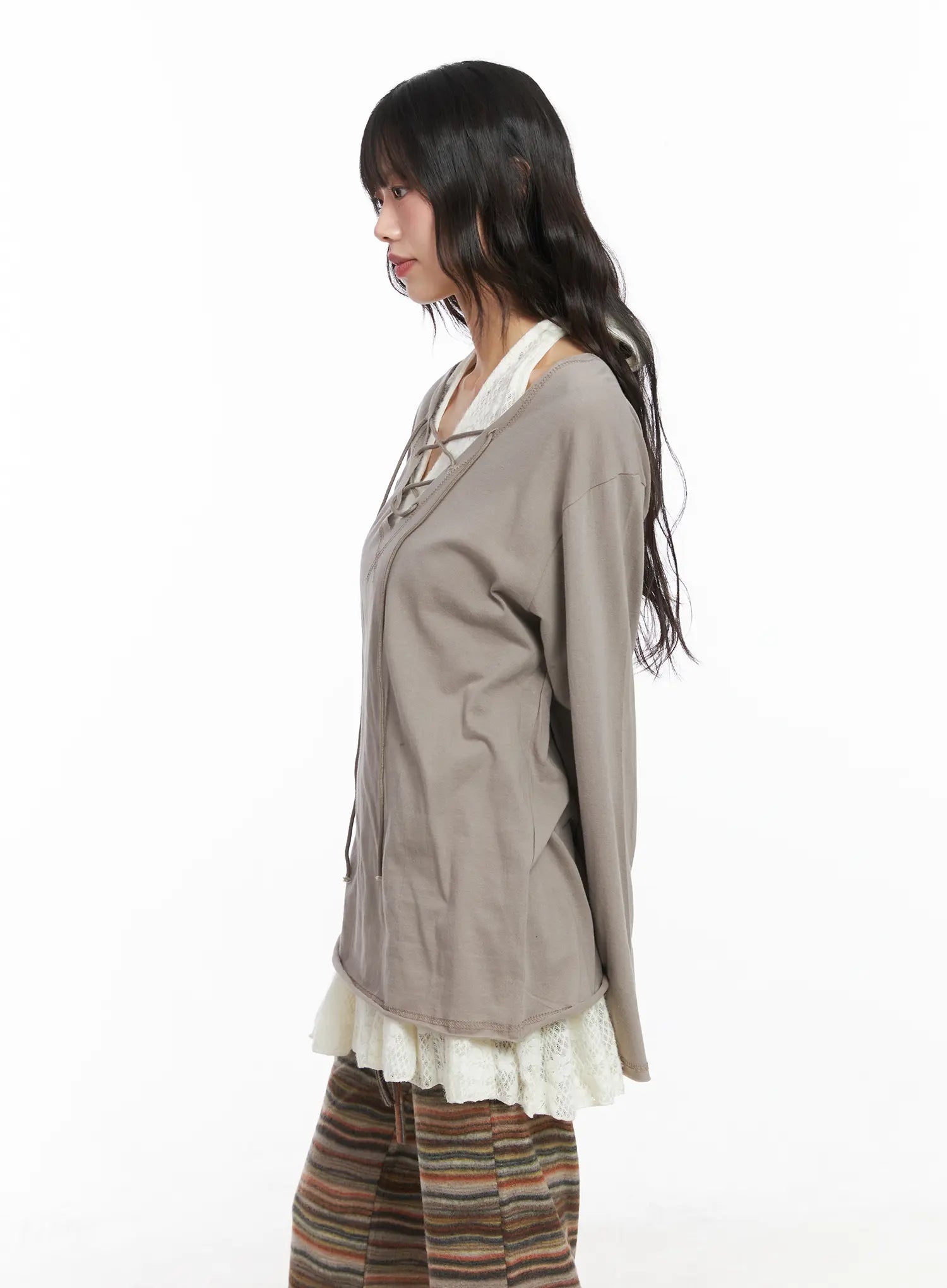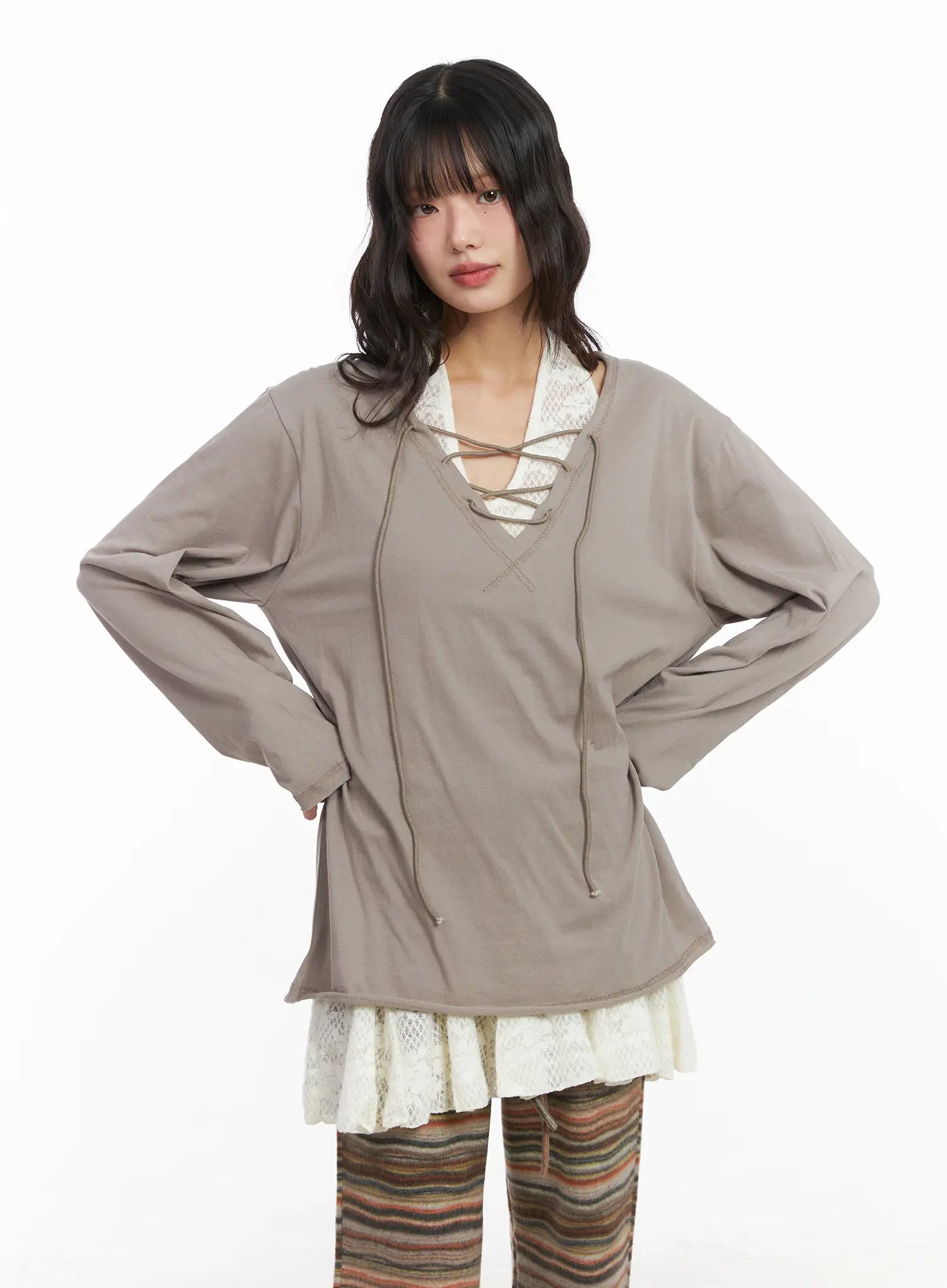 Model is wearing size S/M and the color Beige.