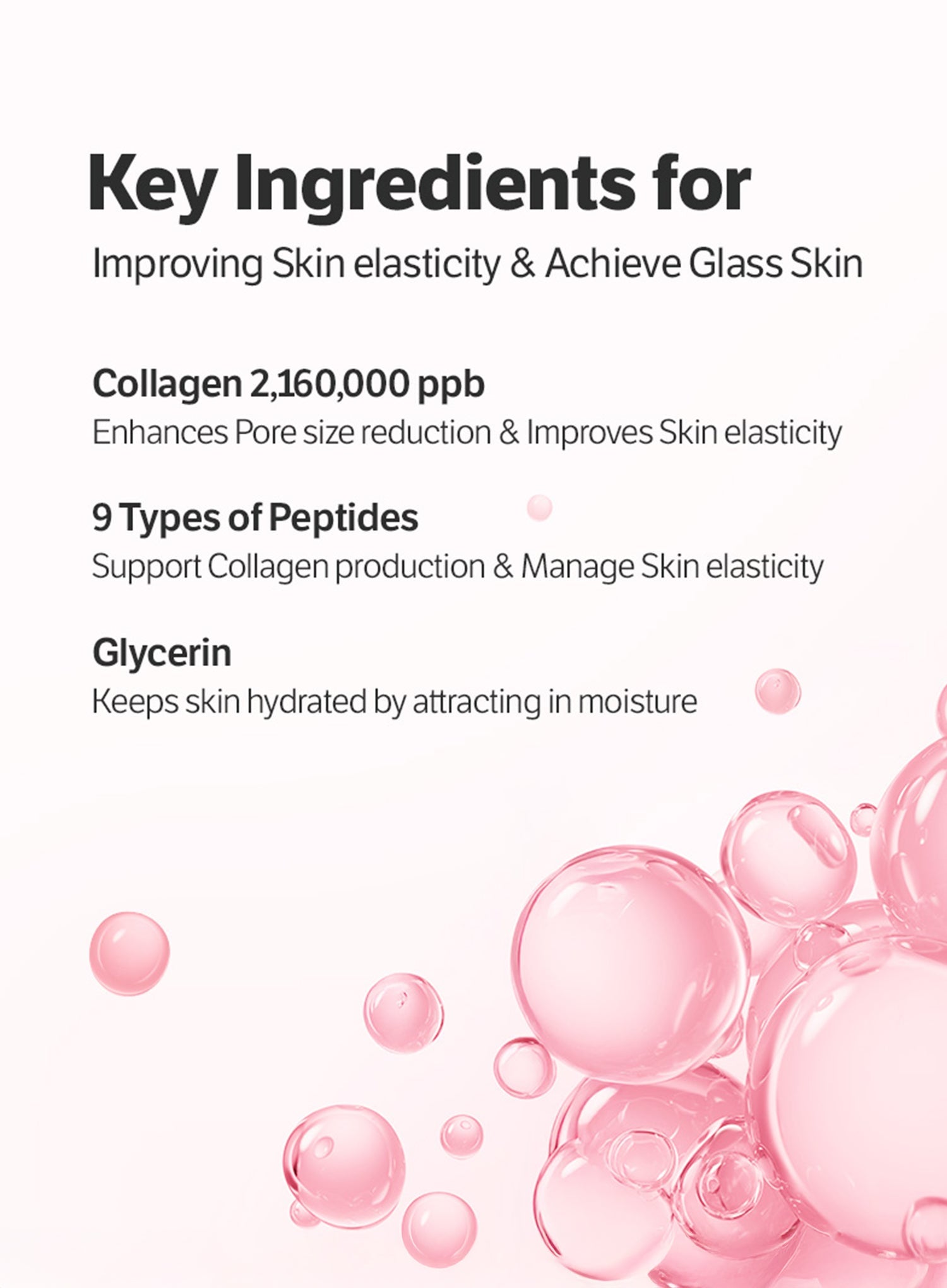 Aqua, Glycerin, Dipropylene Glycol, Cetyl Ethylhexanoate, Niacinamide, 1,2-Hexanediol, Ceratonia Siliqua Gum, Caprylic/Capric Triglyceride, Chondrus Crispus Powder, Betaine, Chondrus Crispus Extract, Hydroxyacetophenone, Panthenol, Collagen, Butyrospermum Parkii Butter, Polysorbate 80, Sucrose, Potassium Chloride, Sodium Polyacrylate, Cellulose Gum, Hydrogenated Polydecene, Hydrogenated Lecithin, Glyceryl Stearate, Adenosine, Ethylhexylglycerin, Trideceth-6, Crataegus Cuneata Fruit Extract, Mentha Piperita Leaf Extract, Mentha Suaveolens Leaf Extract, Mentha Viridis Leaf Extract, Ribes Nigrum Bud Extract, Vanilla Planifolia Fruit Extract, Dipotassium Glycyrrhizate, Ceramide NP, Cetearyl Alcohol, Stearic Acid, Ceramide AP, Ceramide NS, Cholesterol, Phytosphingosine, Butylene Glycol, Caprylyl Glycol, Disodium EDTA, Glyceryl Glucoside, Propanediol, Polyglyceryl-10 Laurate, Xylitylglucoside, Anhydroxylitol, Xylitol, Acetyl Tetrapeptide-2, Hexapeptide-11, Palmitoyl Tripeptide-1, Tripeptide-1 Glucose, Pantolactone, Musa Sapientum Fruit Extract, Palmitoyl Tripeptide-5, Rose Extract, Rubus Suavissimus Leaf Extract, Benzyl Glycol, Hydrolyzed Glycosaminoglycans, Sodium Hyaluronate, Ceramide EOP, Acetyl Tetrapeptide-5, Sodium Hyaluronate Crosspolymer, Hydrolyzed Hyaluronic Acid, Hydroxypropyltrimonium Hyaluronate, Copper Tripeptide-1, Hexapeptide-9, Palmitoyl Pentapeptide-4, Hyaluronic Acid, Sodium Acetylated Hyaluronate