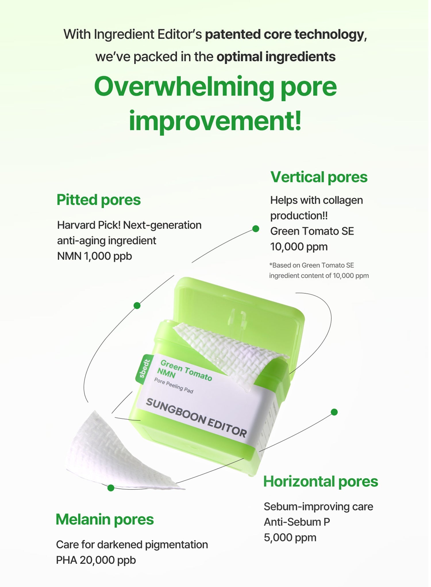 Pre-soaked dual-sided pads cleanse, exfoliate & tighten pores with green tomato & NMN