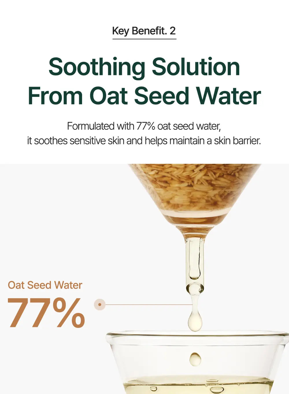 • Contains 77% Oat Seed Water, renowned for its soothing and moisture-enhancing properties, instantly improving the skin's moisture barrier.
