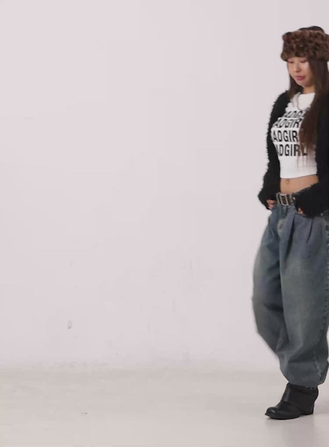 A cropped black bomber jacket, faux leather shorts, and sleek ankle boots combine to form a powerful statement look. Paired with ski poles and a bold attitude, this outfit brings a cyberpunk-inspired twist to traditional winterwear. Designed for those who embrace individuality, it’s the perfect choice for making a locked eyes on the slopes or beyond.