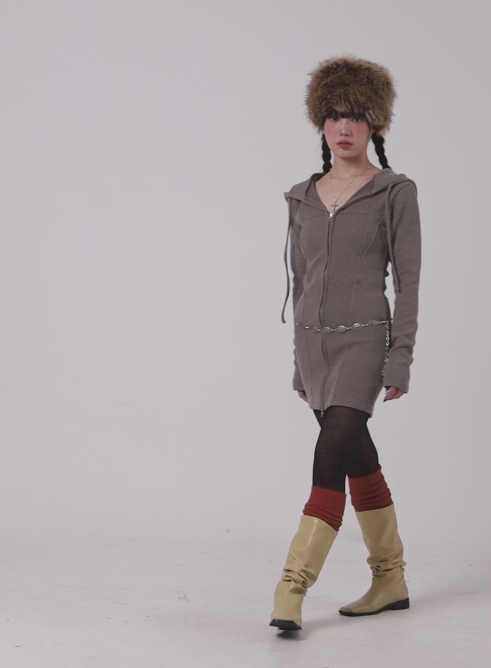 knit-drawstring-hoodie-mini-dress-ij411 / Dark beige