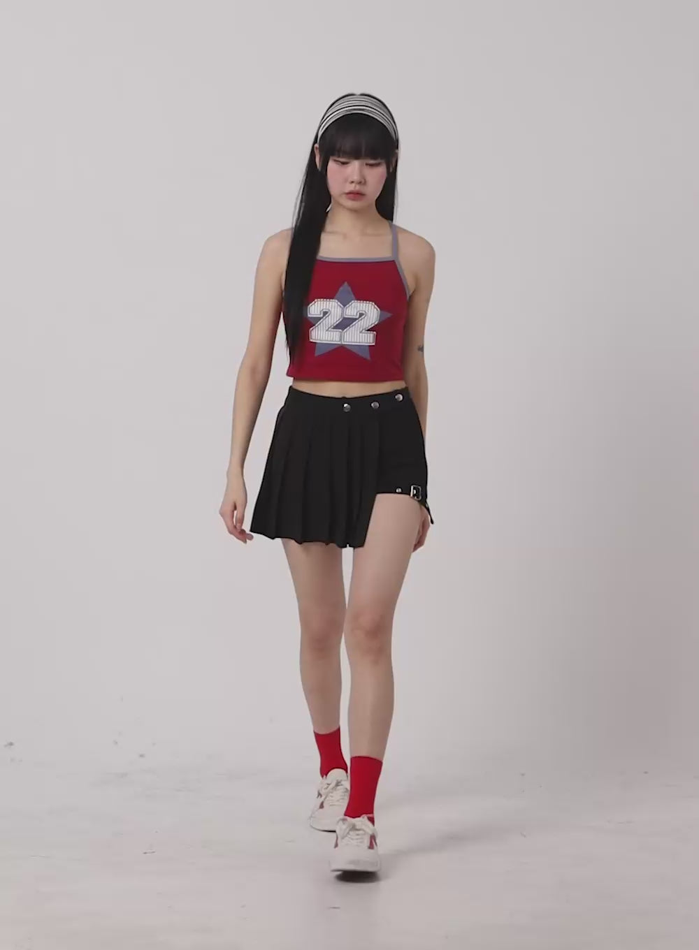 button-unbalanced-pleated-mini-skirt-om426 / Red