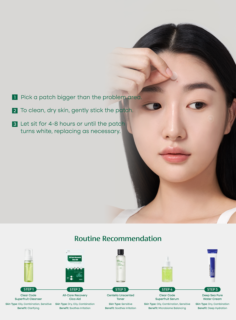 Starting with cleansed, dry skin, apply a patch bigger than the trouble area. Wait for 4-8 hours or until the patch turns white before removing it, replacing as necessary. It can be used during the day or overnight.