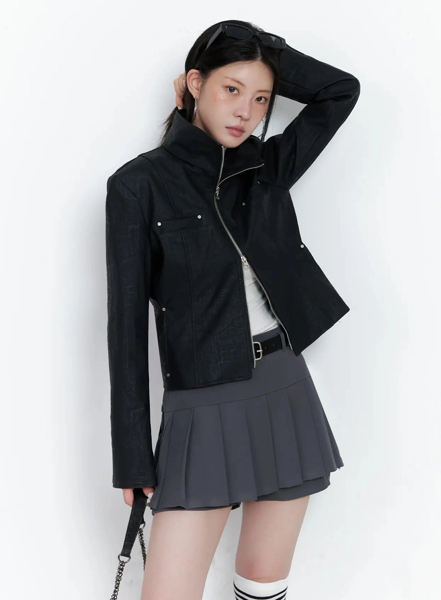 High Neck Zip Up Faux Leather Jacket IS508