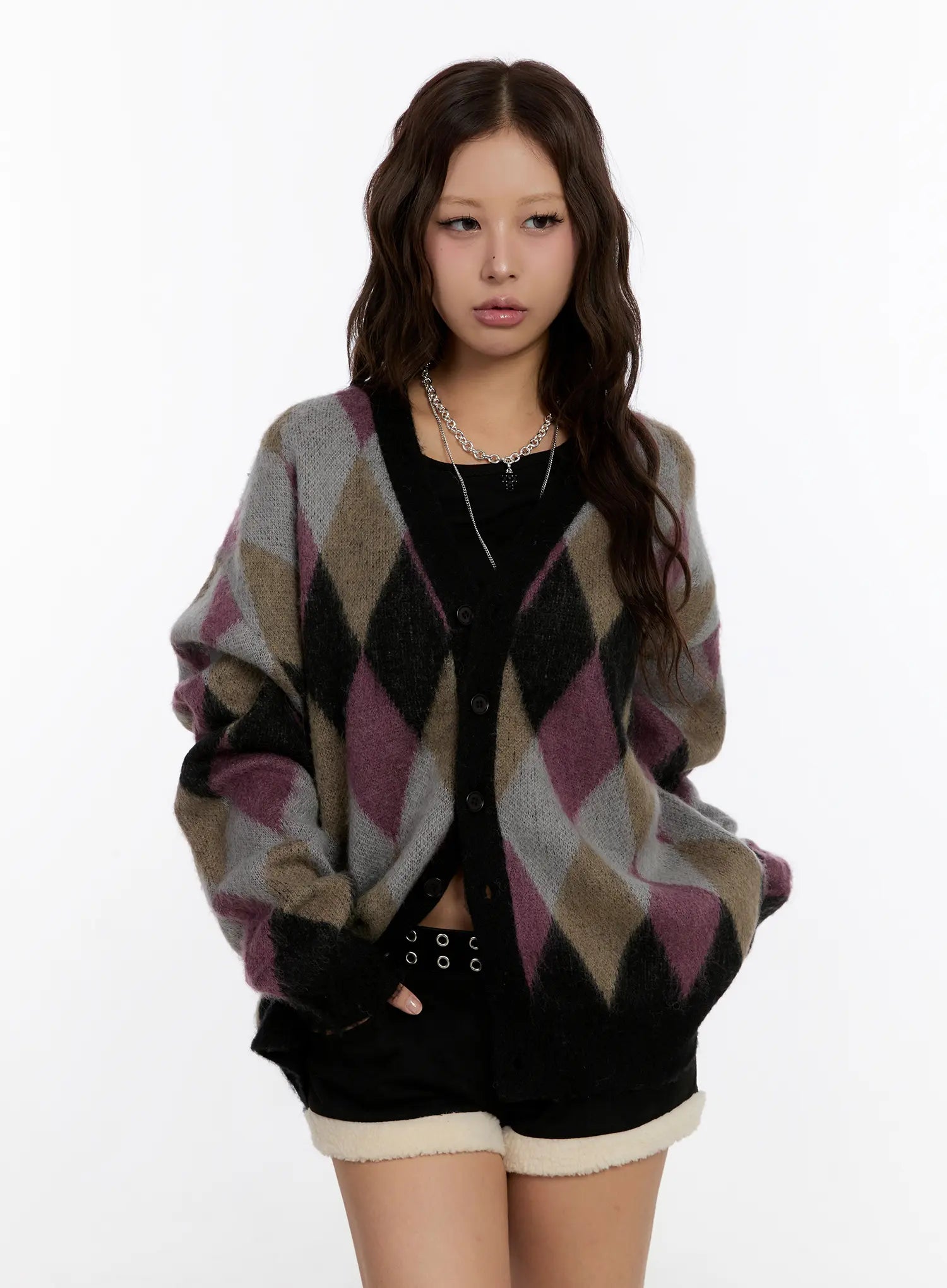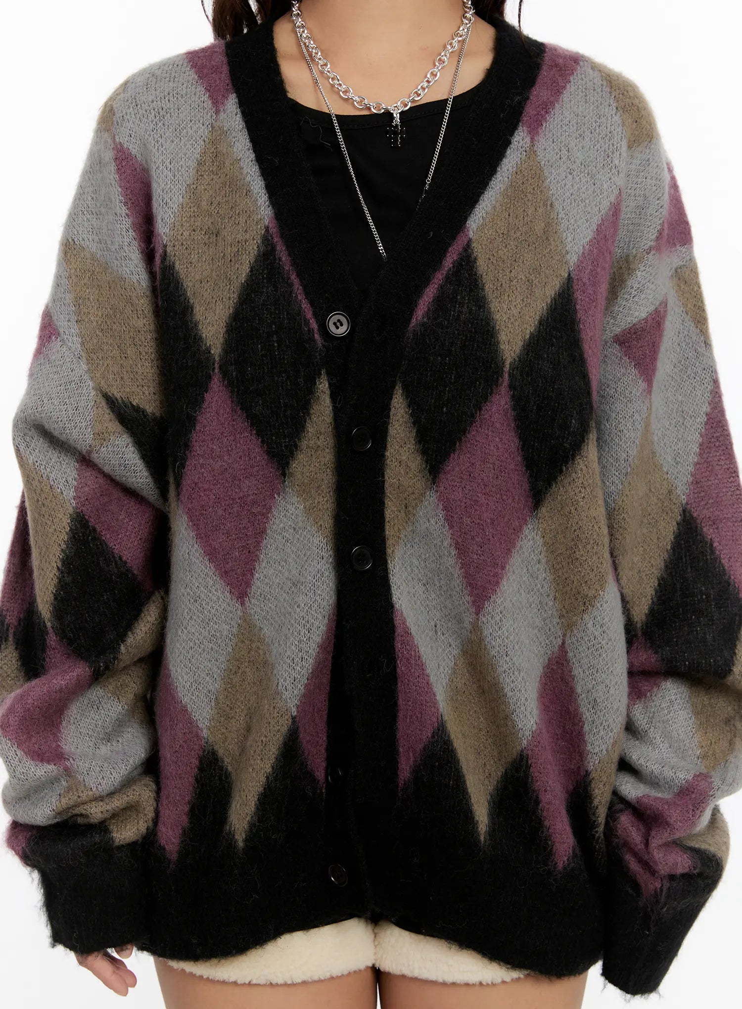 Oversized Multi Color Argyle Knit Cardigan CN527