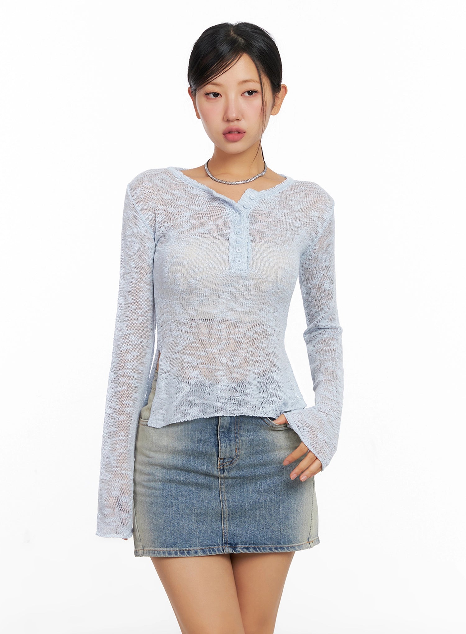 Sheer Buttoned Neck Long Sleeve Top IG527
