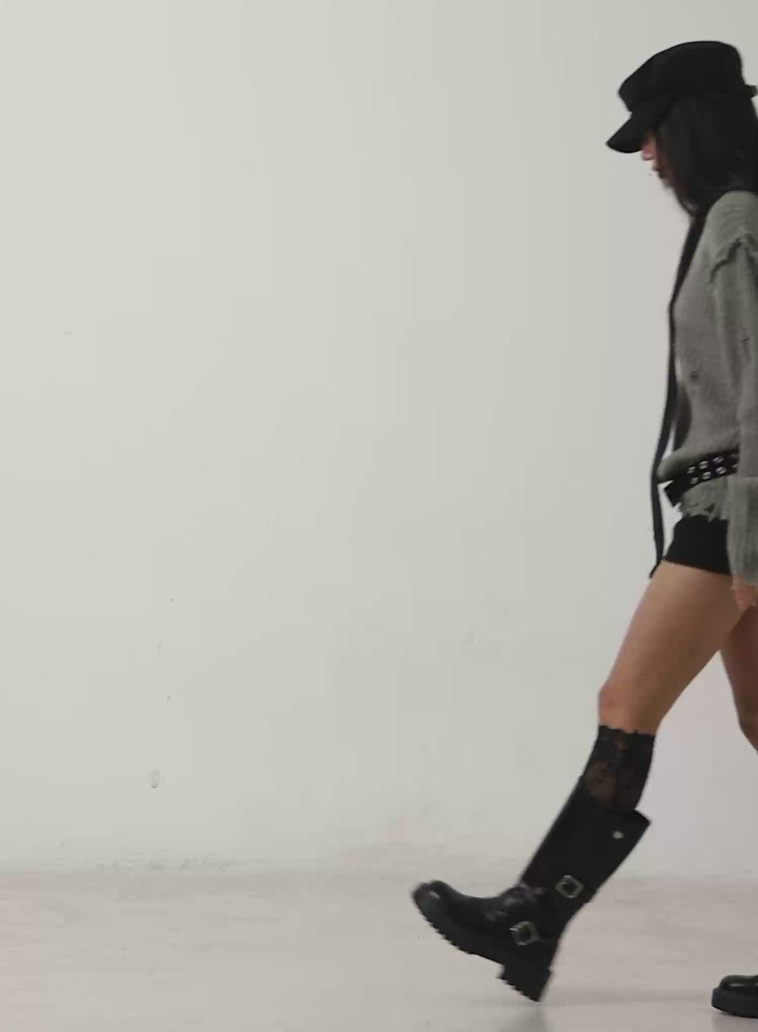 A cropped black bomber jacket, faux leather shorts, and sleek ankle boots combine to form a powerful statement look. Paired with ski poles and a bold attitude, this outfit brings a cyberpunk-inspired twist to traditional winterwear. Designed for those who embrace individuality, it’s the perfect choice for making a locked eyes on the slopes or beyond.