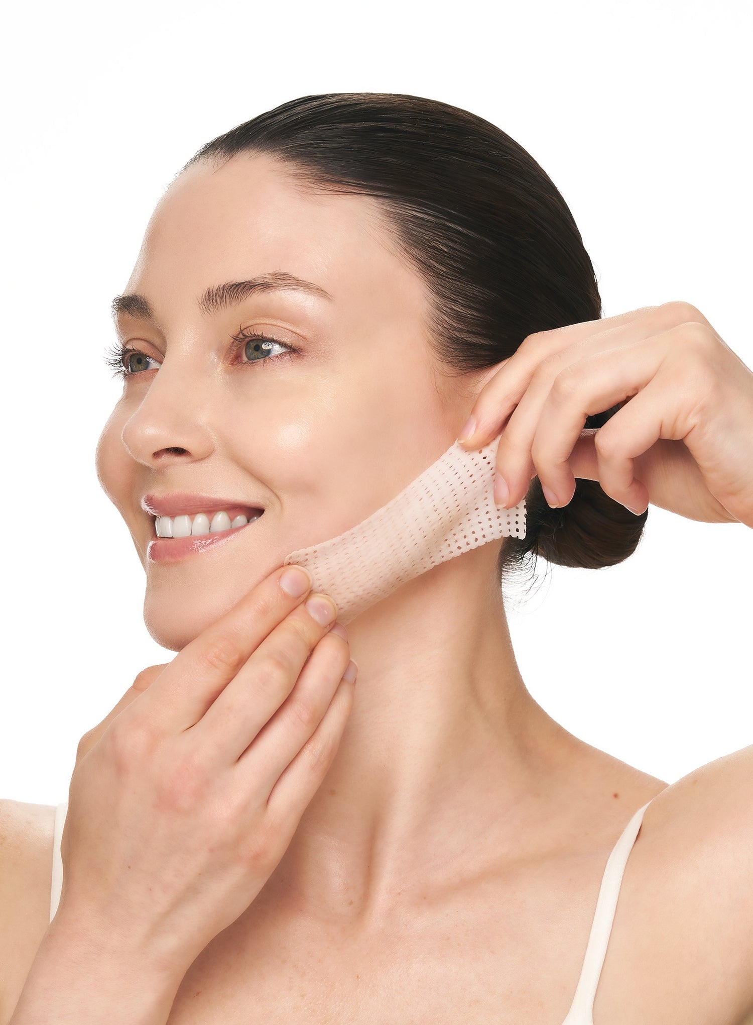 1. For lifting, place pad on skin, stretch upward along jawline.