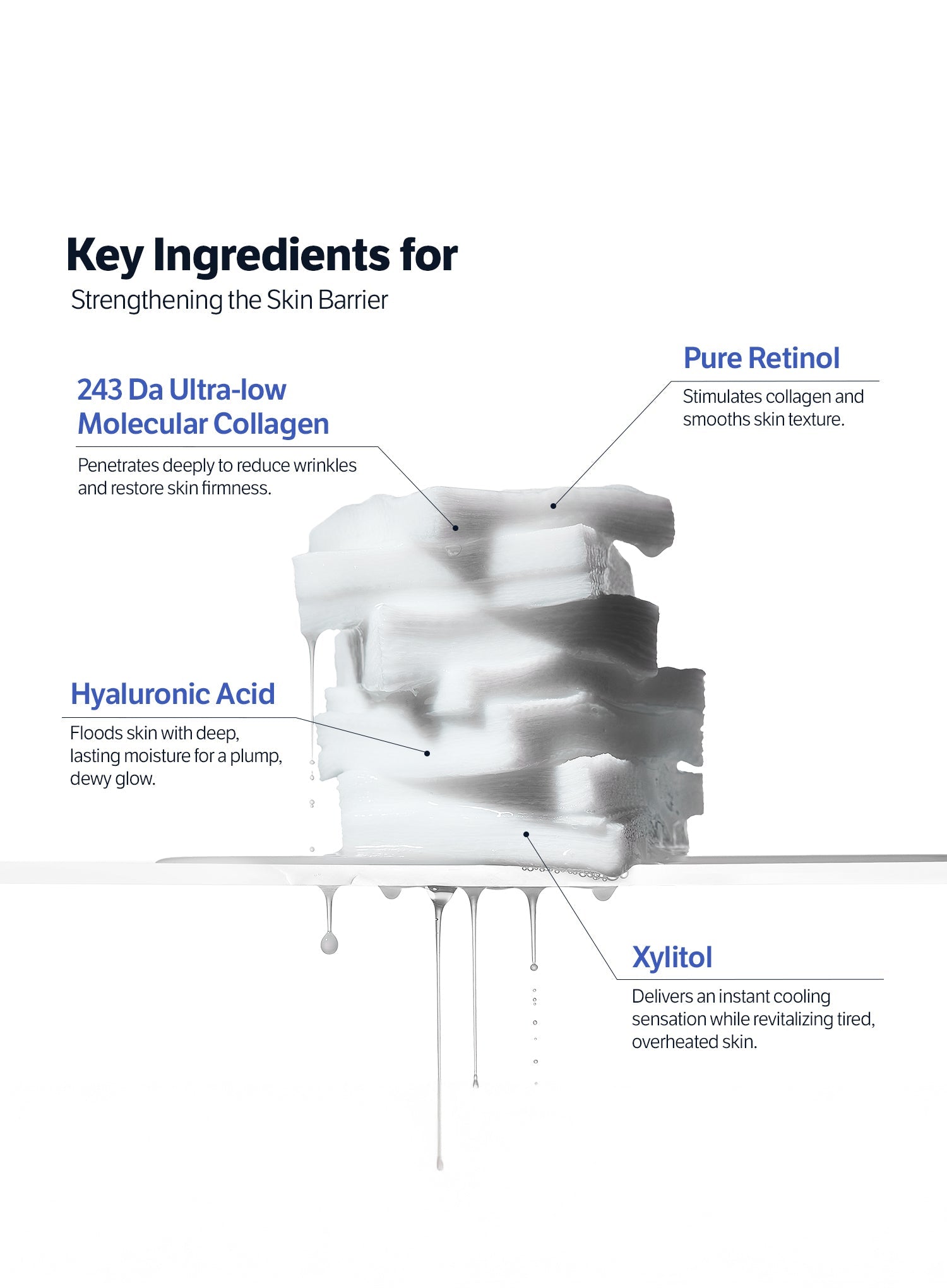Water, Dipropylene Glycol, Glycereth-26, Glycerin, Betaine, 1,2-Hexanediol, Styrene/Acrylates Copolymer, Allantoin, Hydrolyzed Collagen, Xylitol, Hydroxyacetophenone, Ethylhexylglycerin, Caprylyl Glycol, Butyrospermum Parkii (Shea) Butter, C12-14 Alketh-12, Sodium Polyacrylate, Adenosine, Hydrogenated Lecithin, Polyglyceryl-10 Stearate, Centella Asiatica Extract, Lecithin, Polysorbate 20, Sodium Hyaluronate, Retinol, Hydroxypropyltrimonium Hyaluronate, Mentha Rotundifolia Leaf Extract, Camellia Sinensis Leaf Extract, Thymus Vulgaris Leaf Extract, Sodium Acetylated Hyaluronate, Hydrolyzed Hyaluronic Acid, Hyaluronic Acid, Madecassoside, Madecassic Acid, Asiaticoside, Asiatic Acid, Sodium Hyaluronate Crosspolymer, Hydrolyzed Sodium Hyaluronate, Potassium Hyaluronate