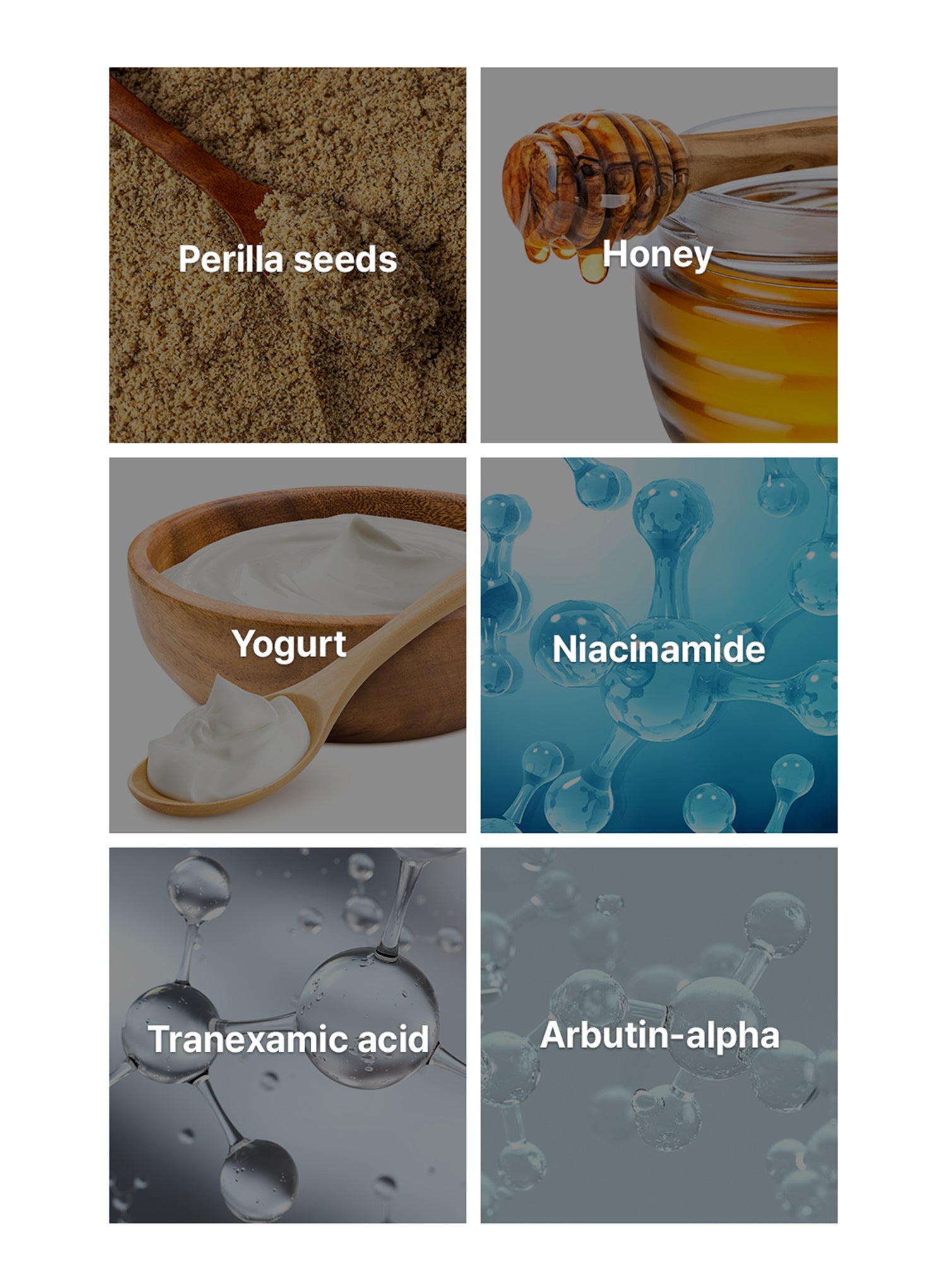 Water, Perilla Frutescens Extract, Glycerin, Butylene Glycol, Niacinamide, Panthenol, Betaine, Allantoin, Ceramide NP, Sodium Hyaluronate, Tocopherol, Adenosine, Carbomer, Arginine, Fragrance.Water, Glycerin, Niacinamide, Isopentyldiol, Perilla Ocymoides Seed Extract, 1,2-Hexanediol, Arginine, Trehalose, Carbomer, Acrylates/C10-30 Alkyl Acrylate Crosspolymer, Hydroxyacetophenone, C12-14 Alketh-12, Ethylhexylglycerin, Caprylyl Glycol, Adenosine, Xanthan Gum, Butylene Glycol, Melia Azadirachta Leaf Extract, Disodium EDTA, Alpha-Arbutin, Tranexamic Acid, Melia Azadirachta Flower Extract, Honey Extract, 3-O-Ethyl Ascorbic Acid, Sodium Polyacrylate, Yogurt Extract.
